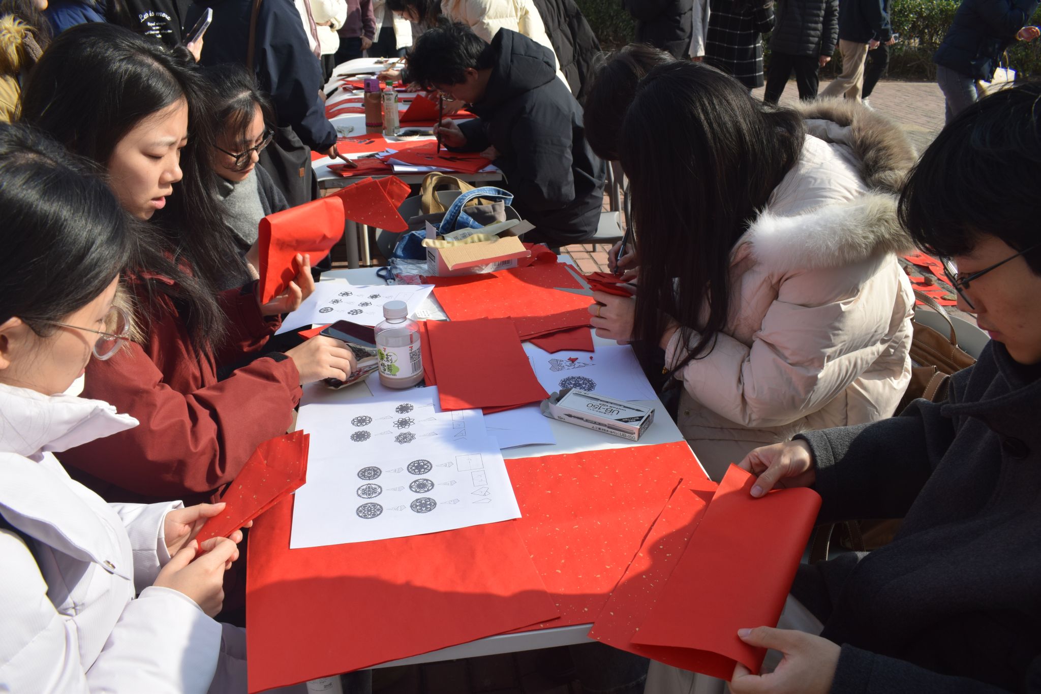 剪纸体验区同样人气高涨、热闹非凡。一张张红色宣纸在指尖灵动流转,剪刀开合起落间,一幅幅精巧别致的窗花便跃然纸上。在志愿者的细致指导下,同学们发挥巧思,沉浸式体验手工创作乐趣,传统剪纸艺术焕发出盎然生机与时代活力。