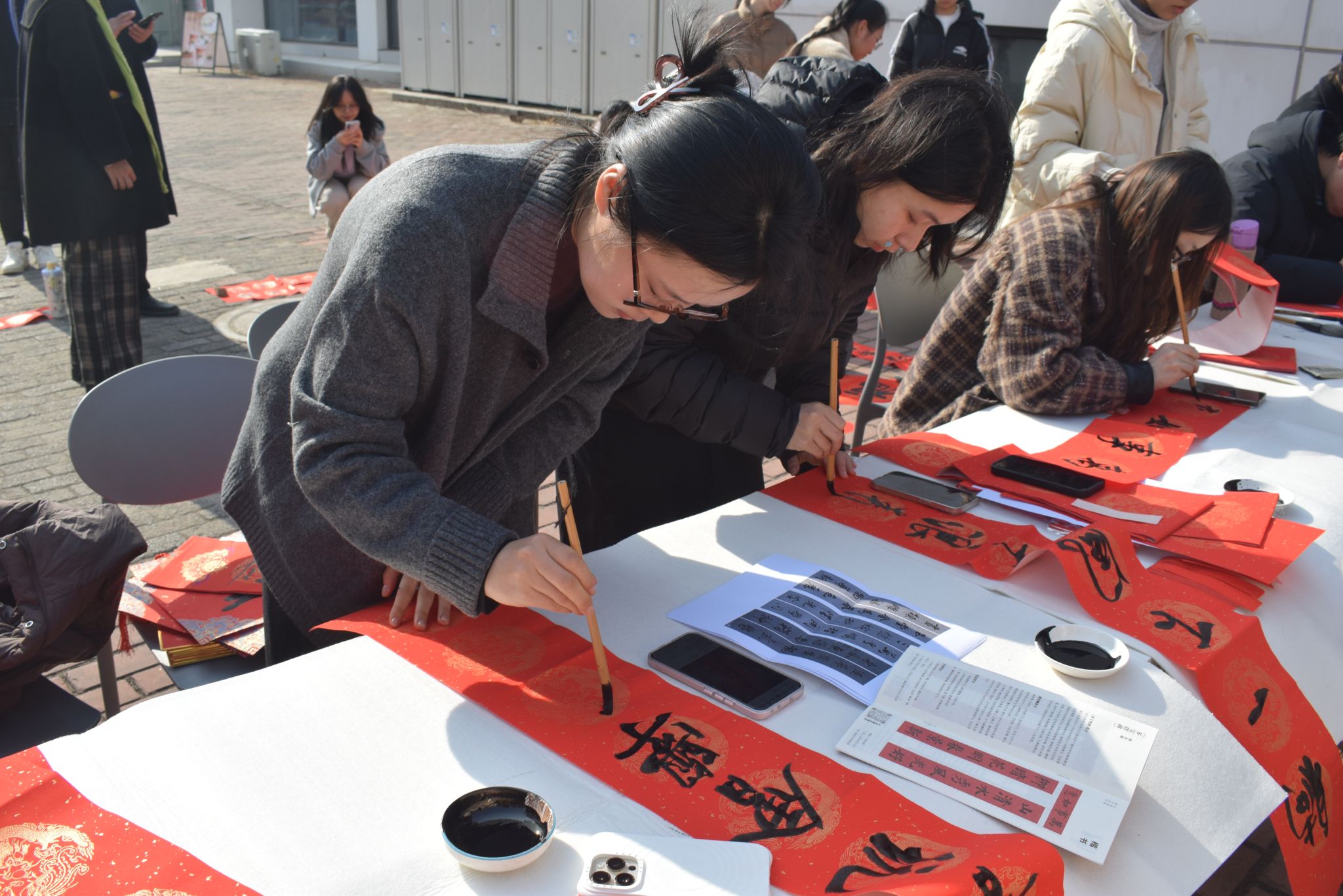 现场精心设置春联福字书写区、剪纸体验区、作品展示区三大特色板块,处处欢声笑语洋溢,满含师生对新年的美好期许。在春联书写区,美术学院书法专业的同学们展纸挥毫,落笔如云,一副副饱含吉祥寓意的春联跃然纸上。师生们既可近距离欣赏专业书法创作的精妙,亦可随心定制专属春联内容,从“骏马奔腾迎盛世”到“福随马蹄踏金至”,每一笔勾勒的都是对新年的美好向往与诚挚祈愿。